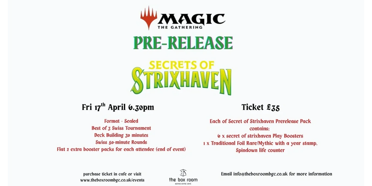 Each attendee will receive a Secret of Strixhaven Pre-release kit containing:
